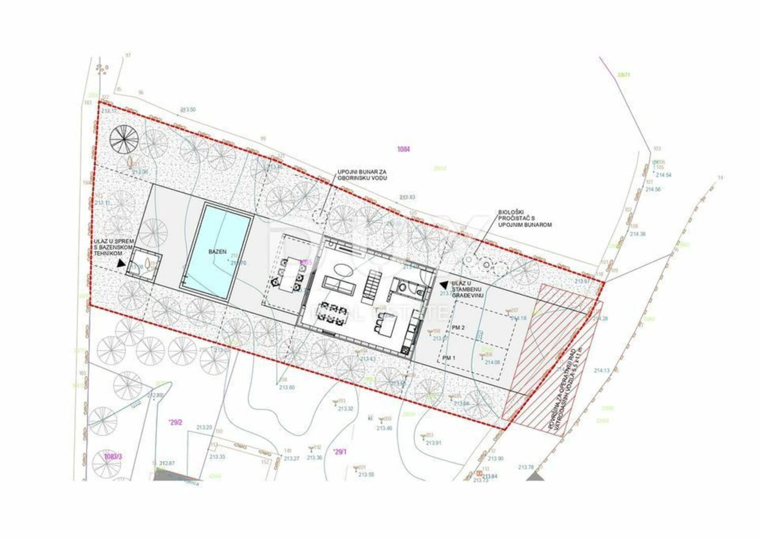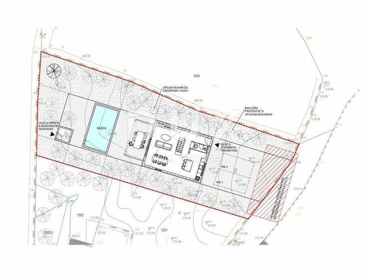 Na navedenom zemljištu je predviđena gradnja samostojeće stambene građevine, prizemlje i kat, pomoćnih građevina - vanjski bazen, spremište sa bazenskom tehnikom, biološki pročistač, predviđena su 2 parkirna mjesta. U prizemlju kuće su predviđene sljedeće prostorije: dnevni boravak, blagovaonica i kuhinja kao open space prostor, ostava, toalet i hodnik. Na kat se dolazi unutarnjim stubištem, a na katu su predviđene 3 spavaće sobe, svaka sa vlastitim kupaonicama.