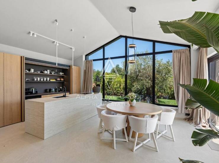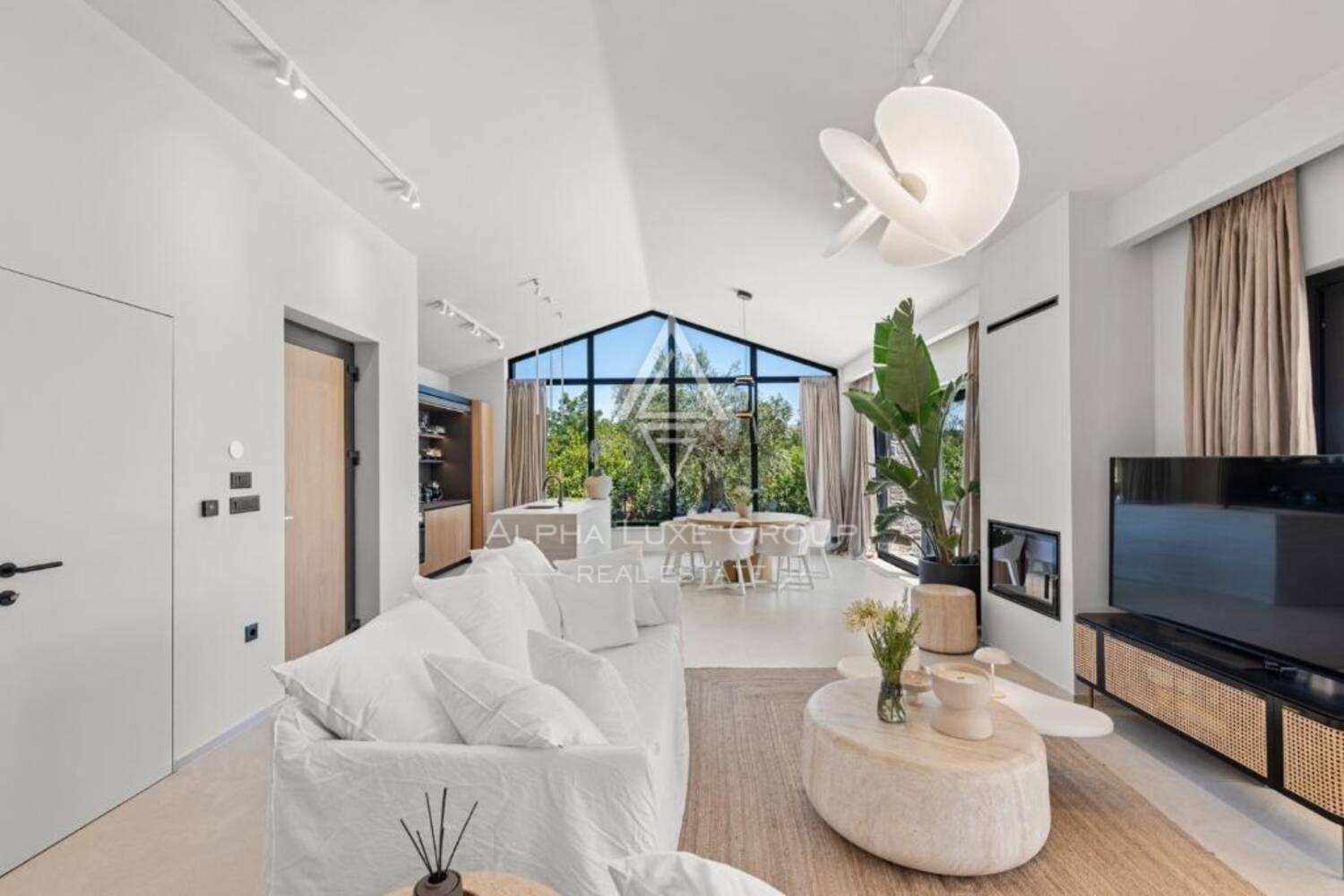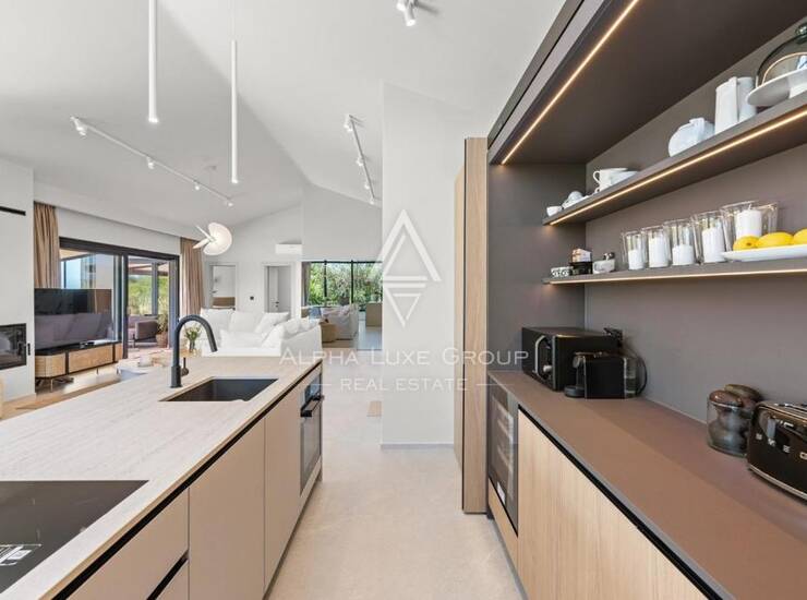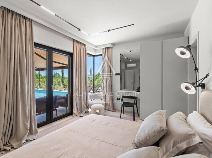 Interijer je u potpunosti dizajnerski uređen, s pažljivo odabranim komadima namještaja renomiranih brendova i vrhunskom opremom koja zadovoljava najviše standarde stanovanja. Prostrani open space dnevni boravak povezan je s kuhinjom i blagovaonicom, čineći centralni dio doma idealnim za druženje i opuštanje. Vila raspolaže s tri elegantno uređene spavaće sobe, svaka s vlastitom kupaonicom, dok dodatna tehnička prostorija osigurava praktičnost svakodnevnog života. U dvorištu se nalazi i ljetna kuhinja s roštiljem, savršena za uživanje na otvorenom tijekom toplijih mjeseci.