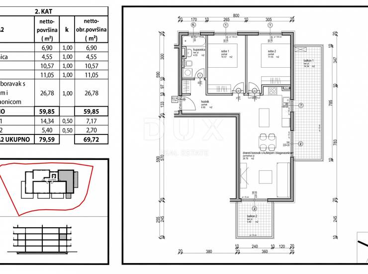 Stan A2 nalazi se na drugom katu zgrade i prostire se na neto površini od 69,72 m². Raspored prostorija osmišljen je tako da maksimizira prostranost i prirodno svjetlo: