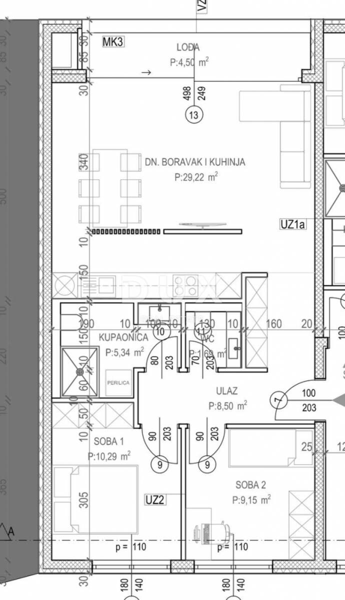 Stan površine 67,57 m² koncipiran je funkcionalno i suvremeno te se sastoji od ulaznog prostora, open-space dnevnog boravka s kuhinjom i blagovaonicom, dvije spavaće sobe, kupaonice, dodatnog WC-a te lođe.