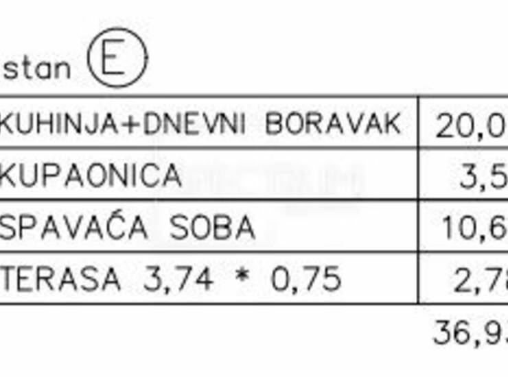 Stan se nalazi na 1.katu novoizgrađene stambene zgrade sa 11 stambenih jedinica. Površina stana iznosi 36.93 m2. Stan se sastoji od dnevnog boravka sa kuhinjom i blagovaonicom open space koncepta, spavaće sobe, kupaonice i natkrivene terase. Sa terase se pruža pogled na Tar i na prirodu.
