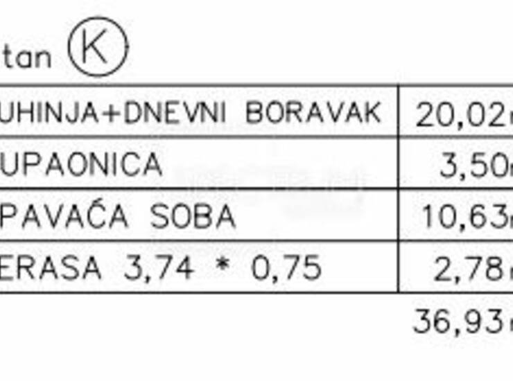 Stan se nalazi na 3.katu novoizgrađene stambene zgrade sa 11 stambenih jedinica. Površina stana iznosi 36.93 m2. Stan se sastoji od dnevnog boravka sa kuhinjom i blagovaonicom open space koncepta, spavaće sobe, kupaonice i natkrivene terase. Sa terase se pruža pogled na Tar i na prirodu.