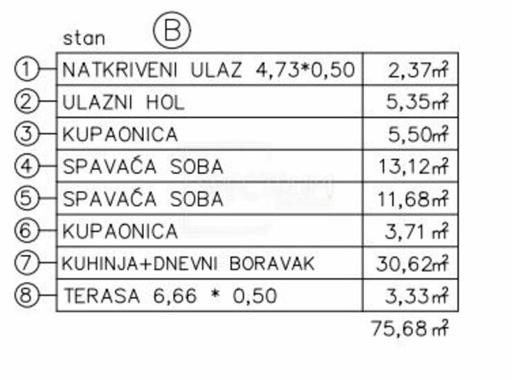 Stan se nalazi u prizemlju novoizgrađene stambene zgrade sa 11 stambenih jedinica. Površina stana iznosi 75.68 m2. Stan se sastoji od dnevnog boravka sa kuhinjom i blagovaonicom open space koncepta, 2 spavaće sobe, 2 kupaonice, ulaznog prostora i natkrivene terase. Na terasu se dolazi iz kuhinje. Sa terase se izlazi na ograđeni vrt površine 80 m2.