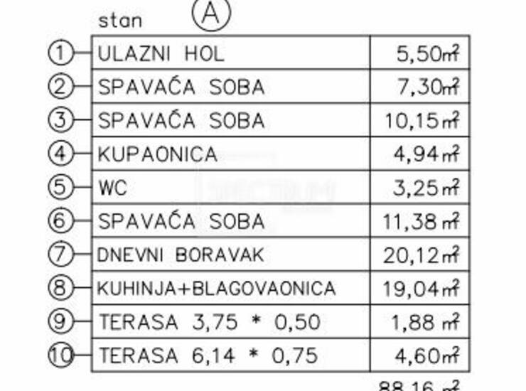 Stan se nalazi u prizemlju novoizgrađene stambene zgrade sa 11 stambenih jedinica. Površina stana iznosi 88.16 m2. Stan se sastoji od dnevnog boravka sa kuhinjom i blagovaonicom open space koncepta, 3 spavaće sobe, kupaonice, wc-a, hodnika i 2 natkrivene terase. Na jednu terasu se izlazi iz kuhinje, a na drugu terase se izlazi iz spavaće sobe. Sa terasa se izlazi na ograđeni vrt površine 80 m2.