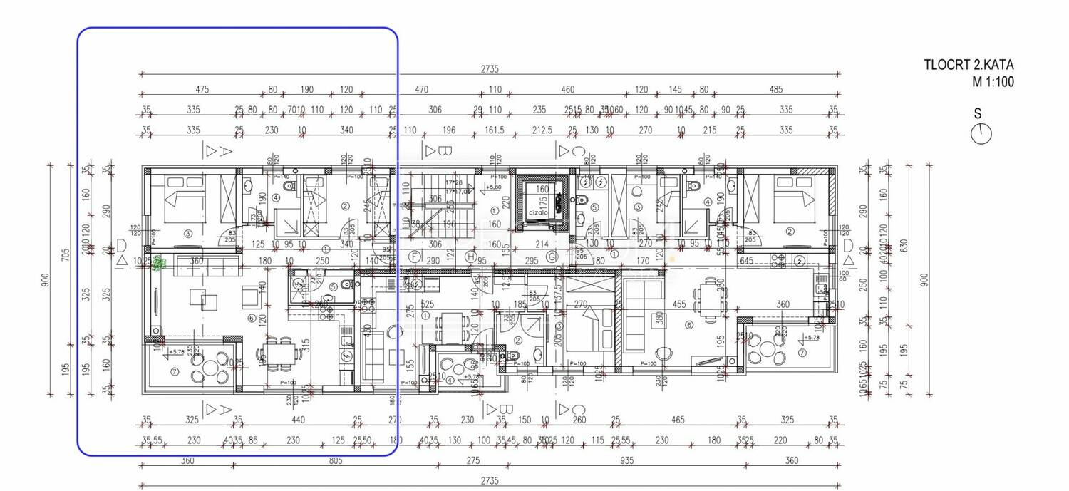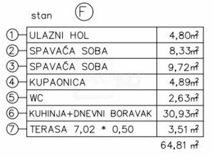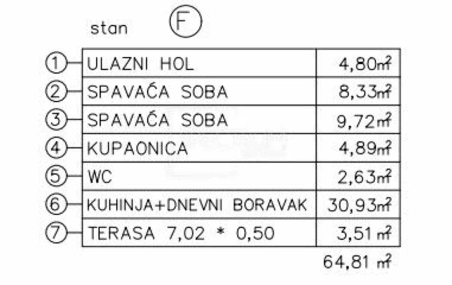 Stan se nalazi na 2.katu novoizgrađene stambene zgrade sa 11 stambenih jedinica. Površina stana iznosi 64.81 m2. Stan se sastoji od dnevnog boravka sa kuhinjom i blagovaonicom open space koncepta, 2 spavaće sobe, kupaonice, wc-a, hodnika i natkrivene terase. Na terasu se dolazi iz dnevnog boravka. Sa terase se pruža pogled na Tar i na prirodu.