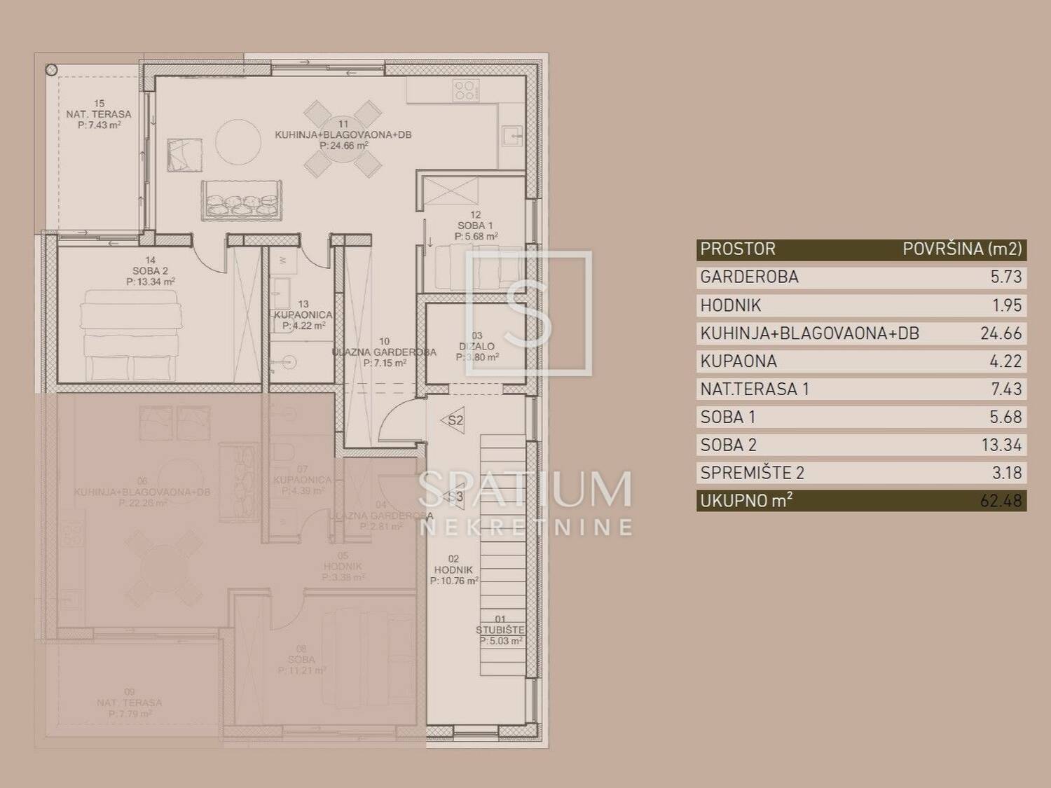 Ovaj lijepo raspoređen dvosoban stan odlikuje se funkcionalnošću i odličnom organizacijom prostora. Stan ukupne površine 65 m² se sastoji od ulaznog prostora s garderobom, hodnika, otvorenog koncepta kuhinje s blagovaonicom i dnevnim boravkom, moderne kupaonice, dvije spavaće sobe te praktičnog spremišta, a dodatnu vrijednost pruža natkrivena terasa od 7,43 m², savršena za opuštanje ili uživanje na otvorenom. Cjelokupna unutarnja organizacija prostora osmišljena je kako bi stan pružio maksimalnu udobnost i ugodan boravak tijekom cijele godine.