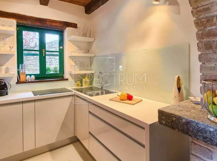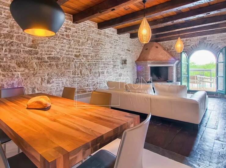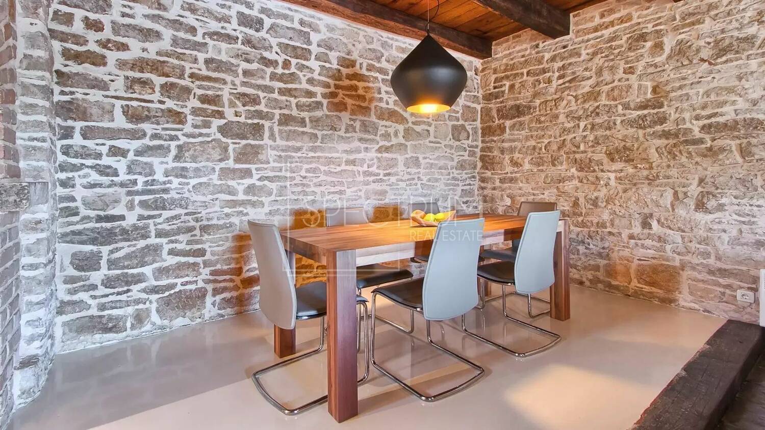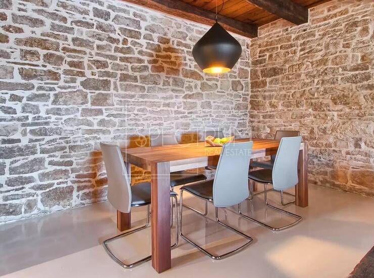 Površina ove tradicionalne istarske kuće iznosi 120 m2, a kuća se proteže kroz prizemlje i kat. U prizemlju se nalazi kuhinja, blagovaonica, komforan dnevni boravak sa kaminom te wc. Iz prizemlja se izlazi na natkrivenu terasu. Unutarnjim stepenicama se dolazi do kata gdje se nalazi hodnik, kupaonica te 2 spavaće sobe, od kojih jedna ima terasu s panoramskim pogledom na lijepu istarsku prirodu.