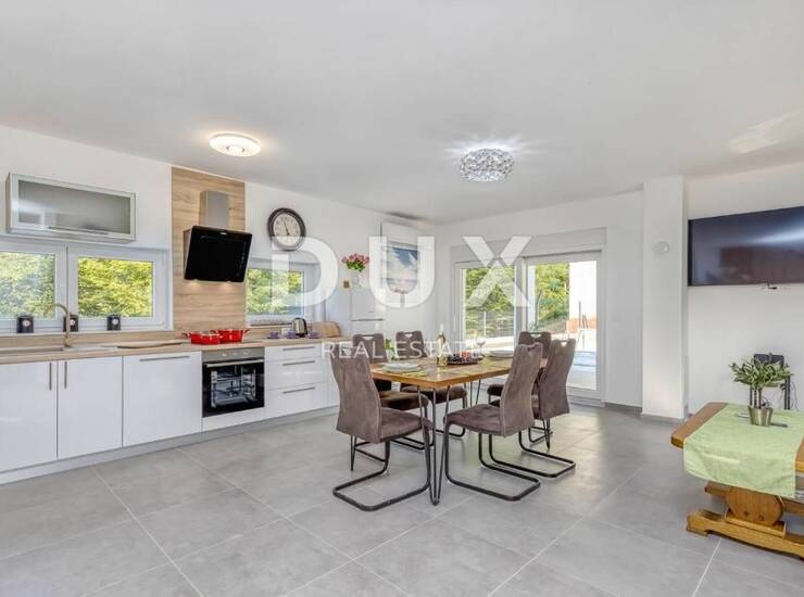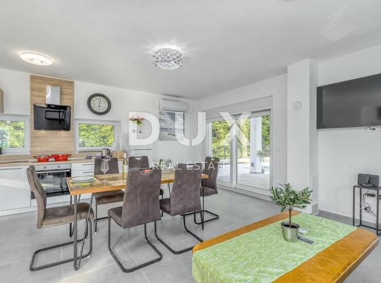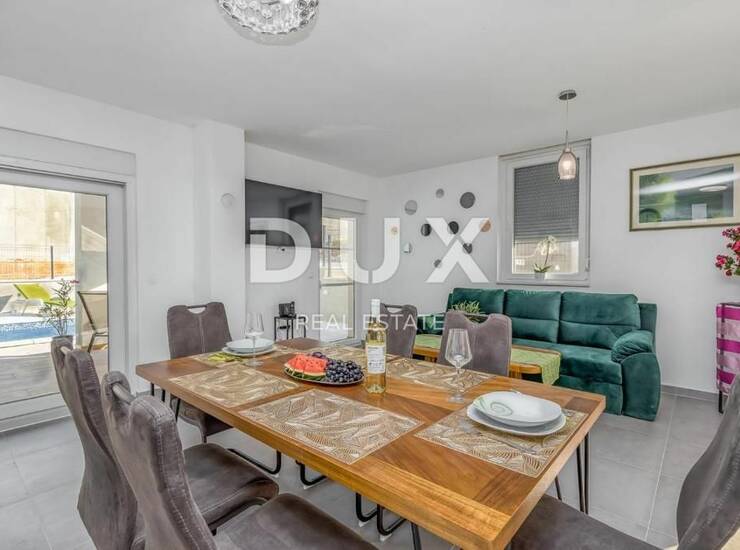 Tako se u prizemlju kuće na samome ulazu nalazi predvorje koje nas dalje vodi prema većem open space prostoru s komotnim dnevni boravkom, blagovaonom i moderno opremljenom kuhinjom. Ovaj prostor krase veće klizne staklene stijenke kroz koje se proteže pogled i pristup prema okućnici kuće i bazenu, te i većoj natkrivenoj terasi idealnoj za opuštanje s prijateljima i obitelji. U prizemlju kuće dodatno se nalaze izdvojeno gostinjsko kupatilo i ostava.