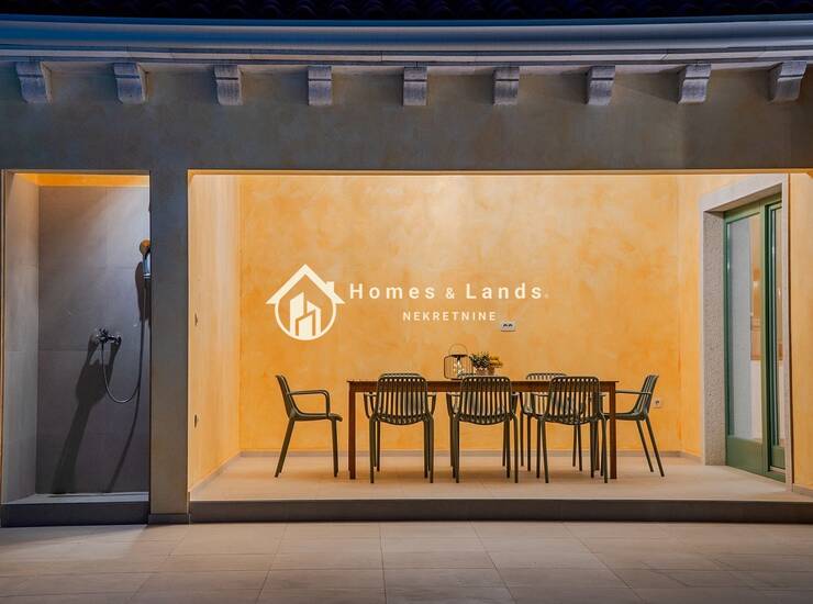 Prostrana terasa i vrt: Velika terasa pruža prekrasan pogled na vrt i vanjski bazen, stvarajući idealno mjesto za opuštanje i uživanje u prirodi.