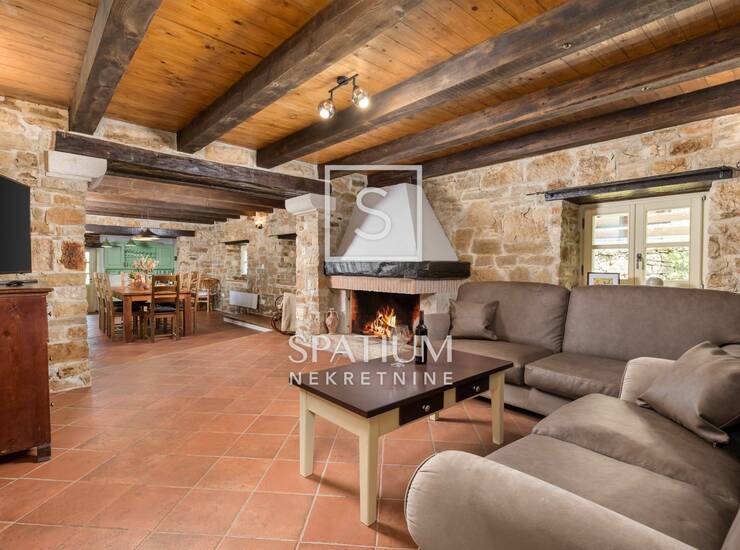 TINJAN, u ponudu smo dobili predivnu kamenu vilu s bazenom smještenu na prekrasno uređenoj i ograđenoj okućnici veličine 700 m2 koja nudi predivan pogled na netaknutu prirodu. Dizajn vile savršeno se uklapa s okolinom, kako izvana, tako i iznutra. U prizemlju vile, prostrani dnevni boravak s otvorenim kaminom zauzima centralno mjesto. Elegantno uređen smeđim tonovima, ovaj prostor pruža ugodnu atmosferu za opuštanje. Drvene grede na stropovima i kamen na zidovima nastavljaju se iz dnevnog boravka u blagovaonicu i prostranu kuhinju. Jedan od detalja koji unosi dodir tradicije u prostor su prozori s prepoznatljivim svjetlo zelenim škurama. Velika staklena vrata vode na terasu koja je okružena uređenim vrtom. Na terasi se nalazi lounge predio s mirisnim biljem, ljetna kuhinja s blagovaonskim stolom te bazen okružen sunčalištem. U uređenju vanjskog prostora naglasak je ponovno stavljen na tradiciju, gdje je kamen korišten za ograđivanje okućnice, dok su u nadstrešnici korištene drvene grede. Vila ima ukupno tri spavaće sobe, svaka s vlastitom kupaonicom. Jedna od spavaćih soba smještena je u prizemlju, s toaletom. Na prvom katu vile nalaze se ostale dvije spavaće sobe koje imaju izlaz na natkrivene prostrane terase. S terasa se pruža predivan panoramski pogled na netaknutu prirodu i more. Sjajan dodatak sadržaju vile je odvojena klimatizirana kućica u kojoj se nalazi prostor za druženje i zabavu. Tu se nalaze biljarski stol, stol za tenis i