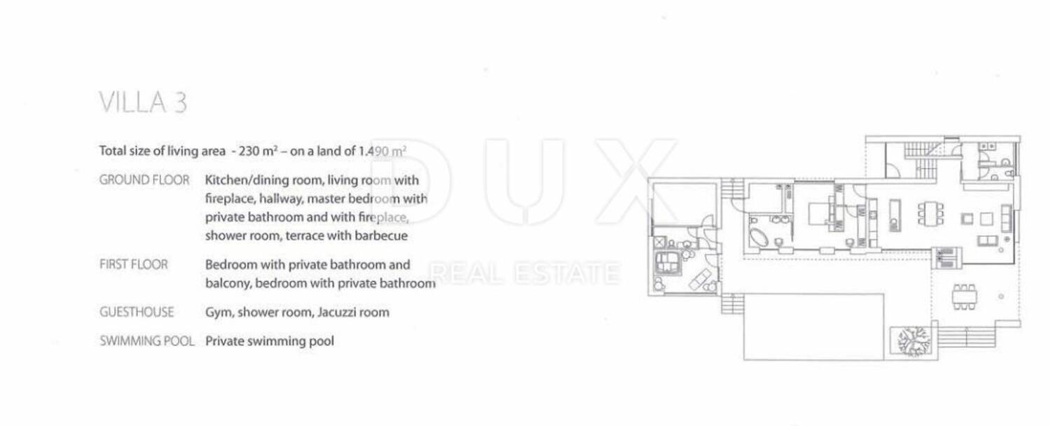 Villa nudi u prizemnom dijelu nudi dnevni boravak s neizostavnim kaminom za poseban ugođaj, kuhinju s blagovaonicom, master spavaću sobu s kaminom i kupaonicom, hodnik i prekrasnu terasu.