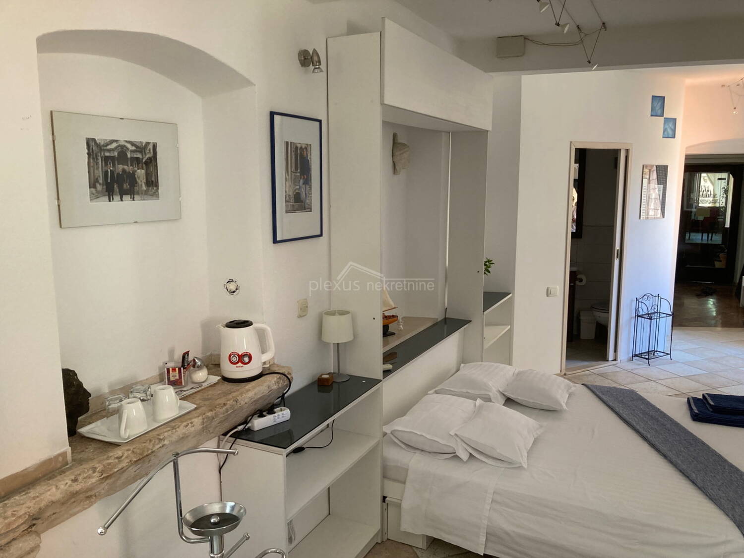 U povijesnom centru Trogira, u staroj gradskoj jezgri izgrađenoj od kamena, nalazi se ova jedinstvena nekretnina u čije uređenje je utkano mnogo truda, estetike i ponajviše ljubavi. Boravak u ovom apartmanu izgleda kao put u prošlost, ali sa svim udobnostima suvremenog življenja. Iz apartmana pruža se na pogled na zelenilo i povijesne detalje drevne gradske jezgre, a detalji u apartmanu su priča iz povijesti grada.