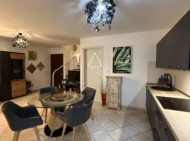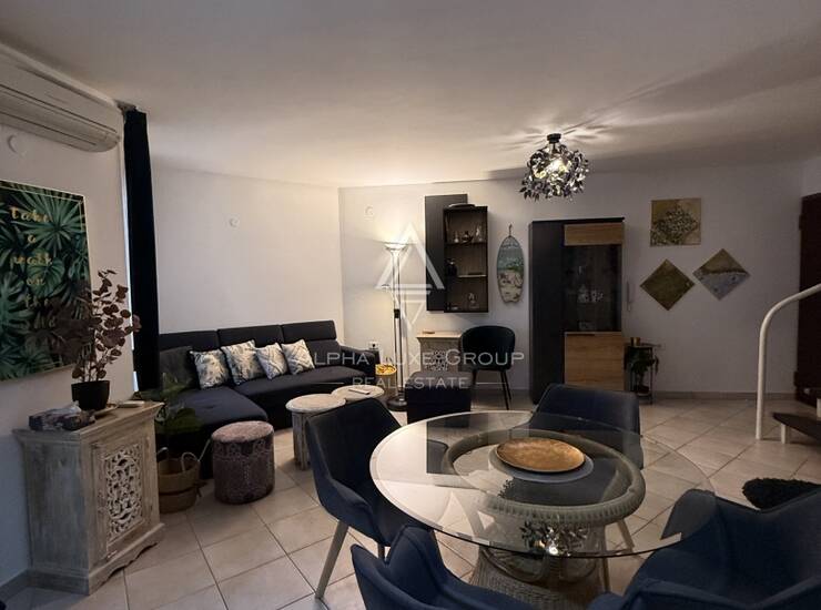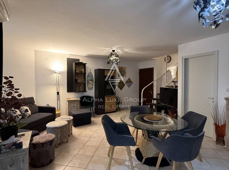 Na prodaju je elegantan dvoetažni stan s otvorenim pogledom na more s obje terase, smješten u traženom području Crvenog Vrha. Stan ima ukupnu stambenu površinu od 83,68 četvornih metara i raspoređen je na prvu i drugu etažu, povezane unutarnjim stubištem. Donja etaža obuhvaća svijetao dnevni boravak s kuhinjom i blagovaonicom, hodnik, kupaonicu i prostranu terasu, dok gornja etaža nudi dvije udobne spavaće sobe, hodnik, kupaonicu i dodatnu terasu s panoramskim pogledom na more.