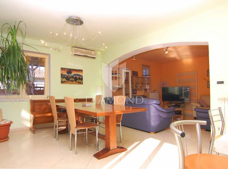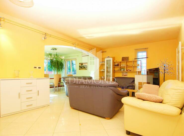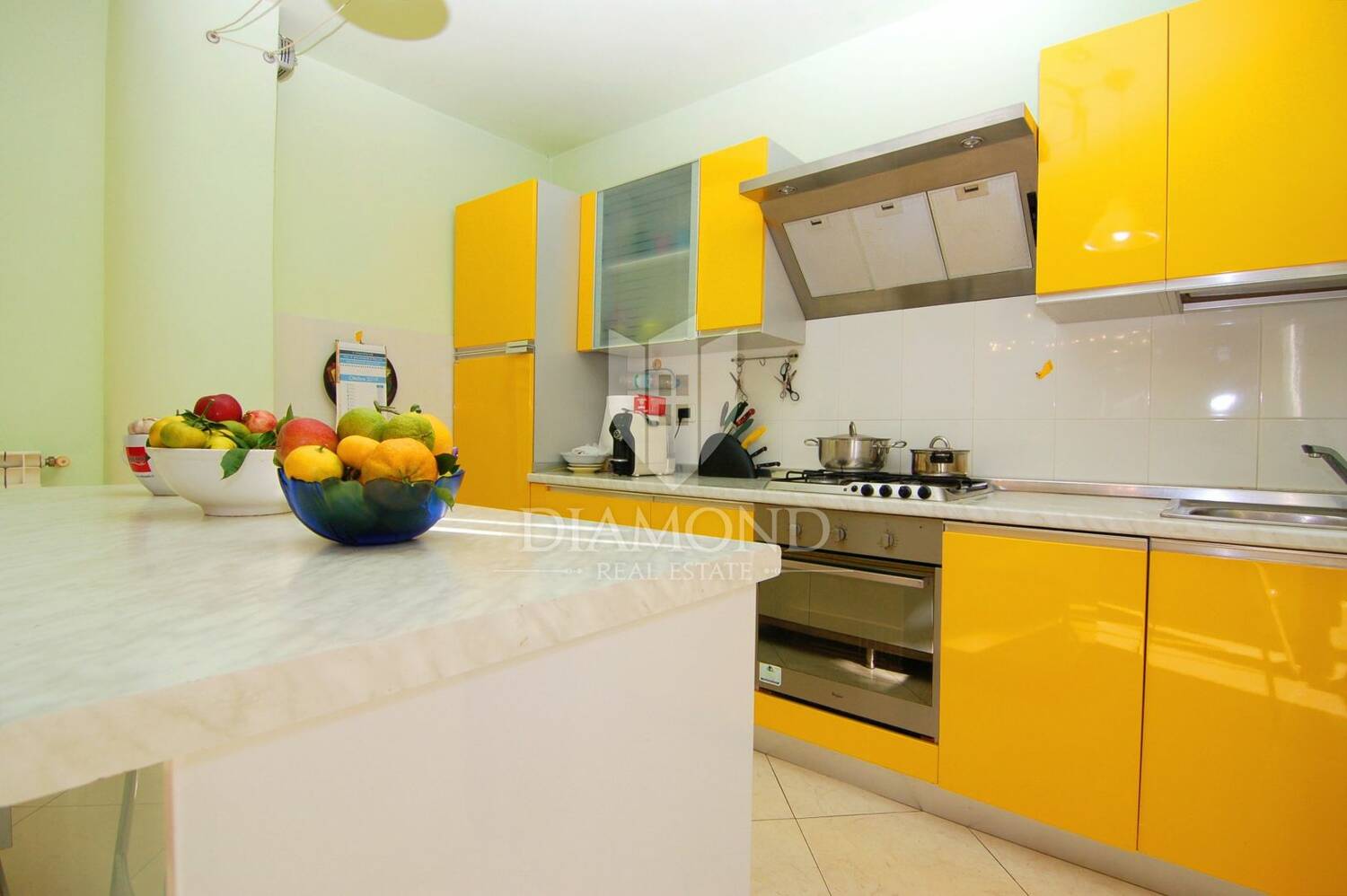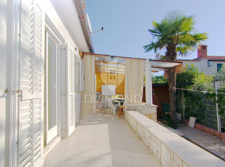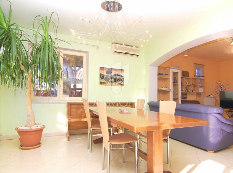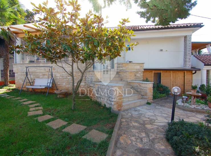 U najekskluzivnijem dijelu Umaga na samo 100 m od mora prodaje se ova samostojeća kuća. Nalazi se na lijepo uređenoj zelenoj okućnici od 488 m2 i sastoji se od dva stana. U visokom prizemlju se nalazi prostrani stan sa velikom dnevnom sobom, kuhinjom sa otokom i blagovaonskim stolom za 8 osoba, te velike spavaće sobe i kupatila.