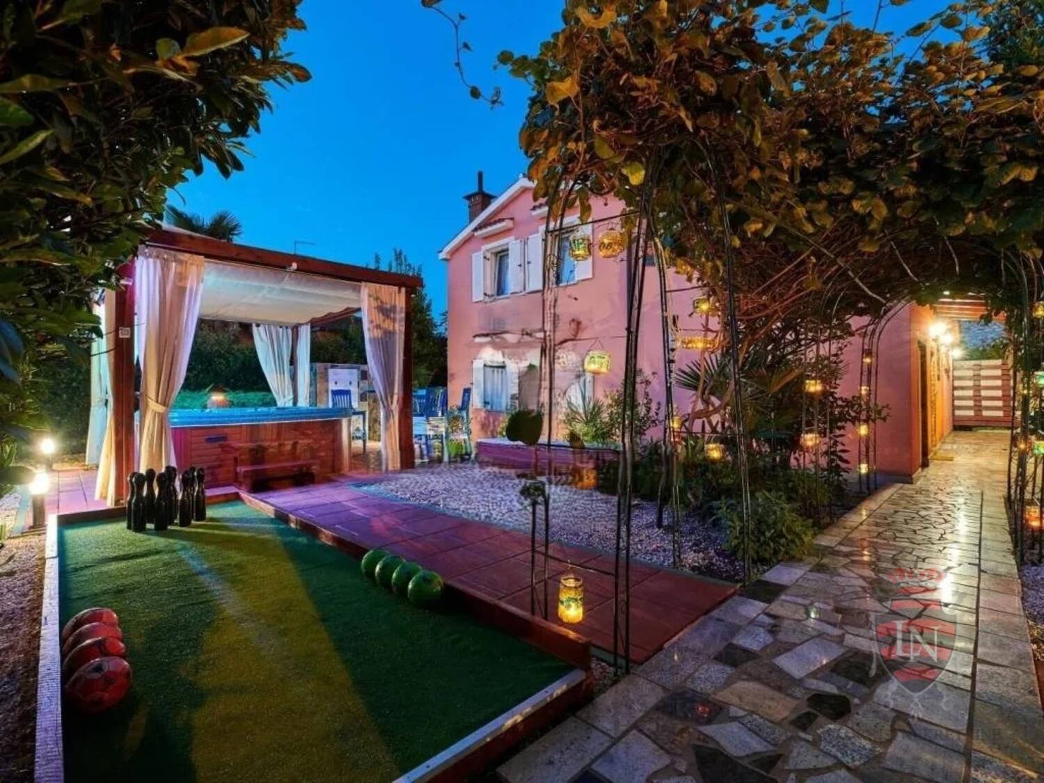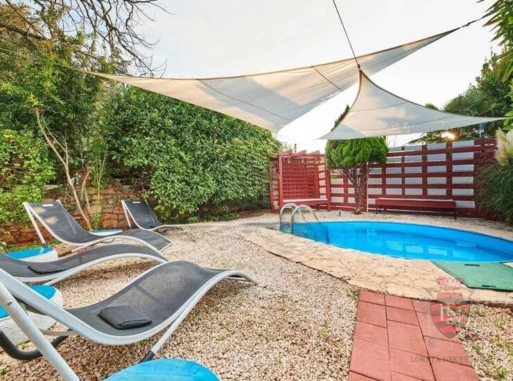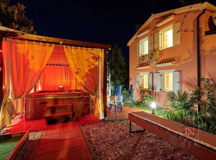 Vanjski prostor idealan je za opuštanje i zabavu, s terasom, roštiljem, bazenom, jacuzzijem i prostorima za razne sportske aktivnosti. Nekretnina ima parking za tri vozila, visoku živicu i drvenu ogradu koja osigurava maksimalnu privatnost. Opremljena je s četiri klima uređaja, kaminom i alarmnim sustavom s kamerama. Prodaje se potpuno namještena, što je čini idealnim rješenjem za useljenje ili investiciju u turizam.