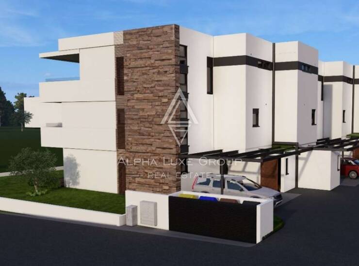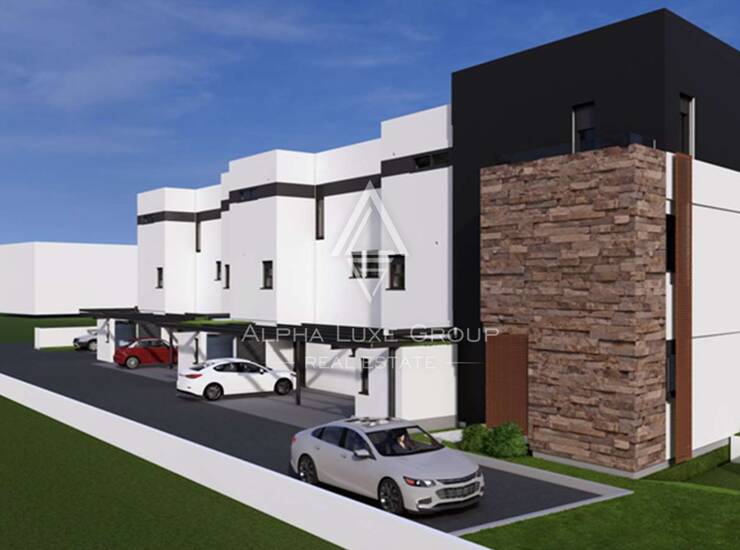 Each residence spans three levels and features four spacious bedrooms and four elegant bathrooms. The ground floor offers a bright open-plan living area with a modern kitchen, a covered loggia, and a terrace leading directly to a private garden. Additional conveniences include indoor and outdoor storage rooms and two private parking spaces with a pergola.