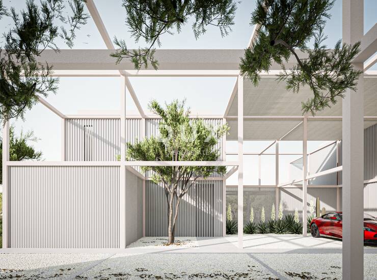 Prije ulaska u kuću, s prednje vanjske strane nalaze se parking za dva automobila i spremište.