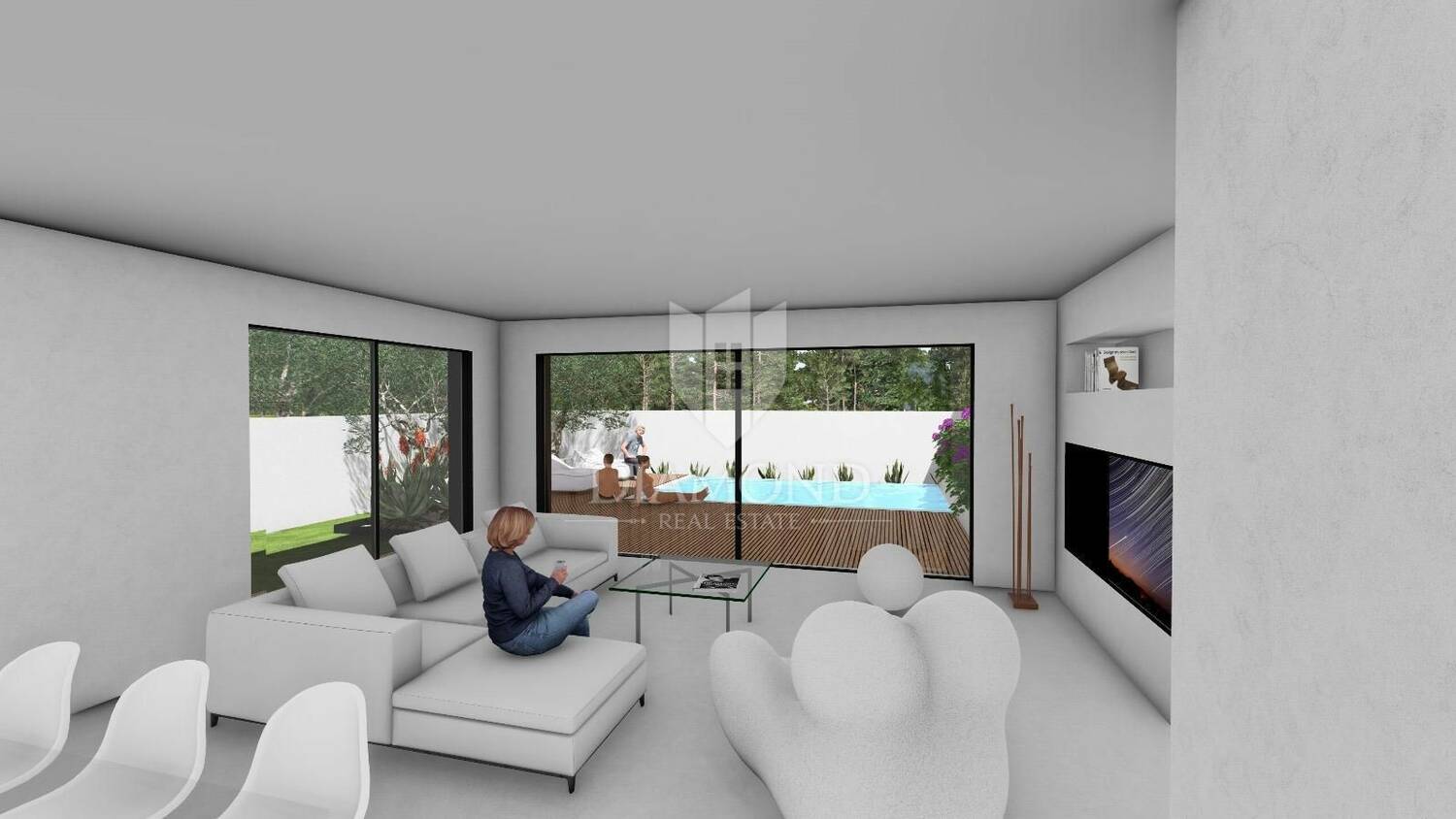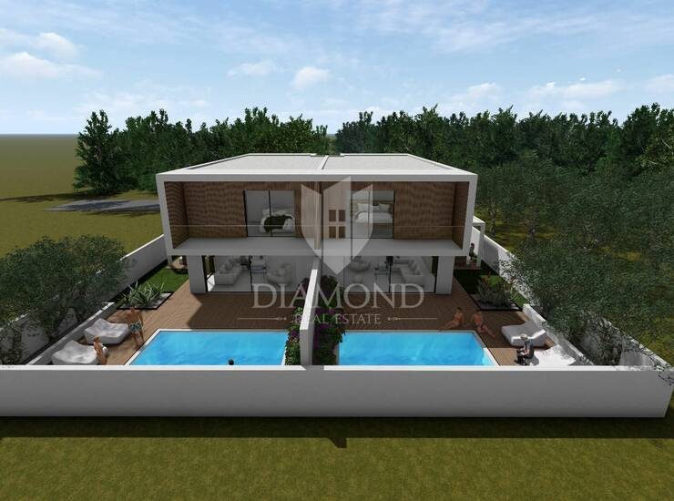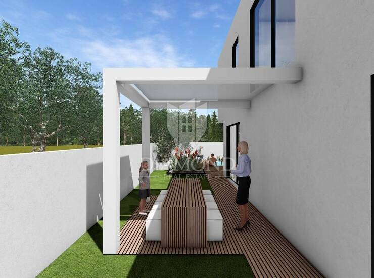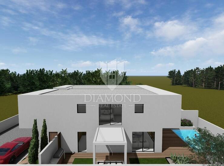 Moderna dvojna kuća 100 m2 s bazenom smještena na mirnoj lokaciji, na rubu naselja, svega nekoliko kilometara od Umaga. Nekretnina je idealna za miran obiteljski život, ali i kao investicija za turistički najam zahvaljujući atraktivnoj poziciji i funkcionalnom rasporedu.