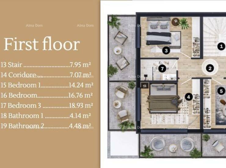 Na prvi kat se ide stepenicama i sastoji se od hodnika, 3 spavaće sobe, od kojih je jedna master bedroom sa ensuite kupatilom, jos jednim kuptatilom i svaka soba ima izlaz na natkriveni balkon.