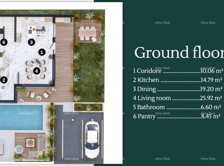 Villa A4, ukupne površine 249.23 m2 stastoji se od prizemlja i prvog kata. U prizemlju se nalazi hodnik, dnevni boravak, kuhinja sa blagovaonicom, kupatilo i ostava.