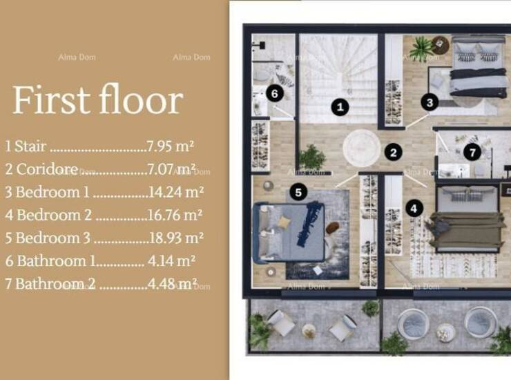 Na prvi kat se ide stepenicama i sastoji se od hodnika, 3 spavaće sobe, od kojih je jedna master bedroom sa ensuite kupatilom, jos jednim kuptatilom i svaka soba ima izlaz na natkriveni balkon.