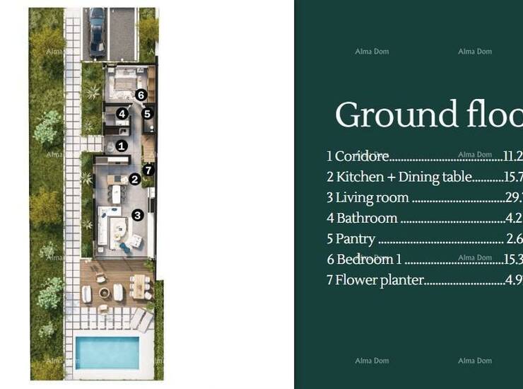 Villa B19, ukupne površine 211.95 m2 sastoji se od prizemlja i prvog kata. U prizemlju se nalazi hodnik, dnevni boravak, kuhinja sa blagovaonicom, kupatilo, spavaća soba, ostava i zeleni dio za cvijeće.