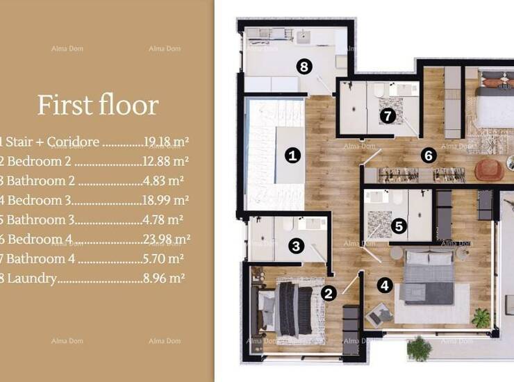 Na prvi kat se ide stepenicama i sastoji se od hodnika, 3 spavaće sobe, 3 kupatila, ostava i terase.
