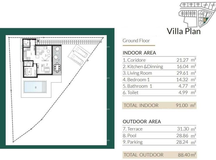 Villa C13, ukupne površine 273.91 m2 sastoji se od prizemlja i prvog kata. U prizemlju se nalazi hodnik, dnevni boravak, kuhinja sa blagovaonicom, kupatilo, spavaće sobe, WC, ostava.