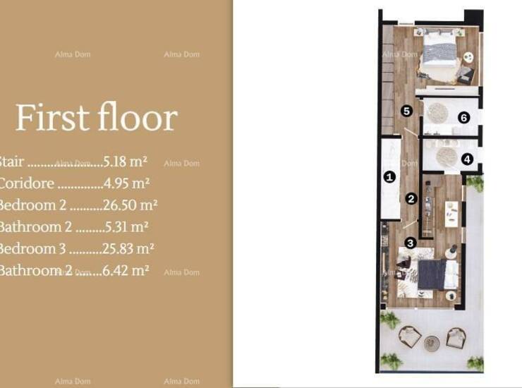 Na prvi kat se ide stepenicama i sastoji se od hodnika, 2 spavaće sobe, 2 kupatilai velike natkrivene terase.