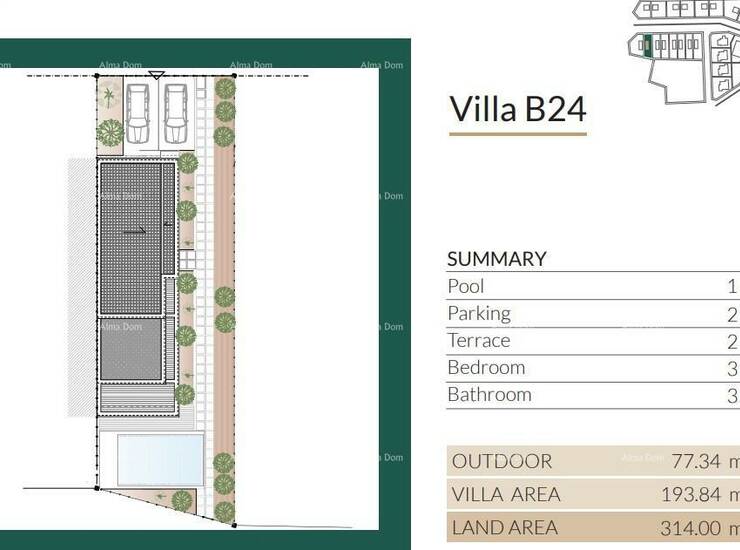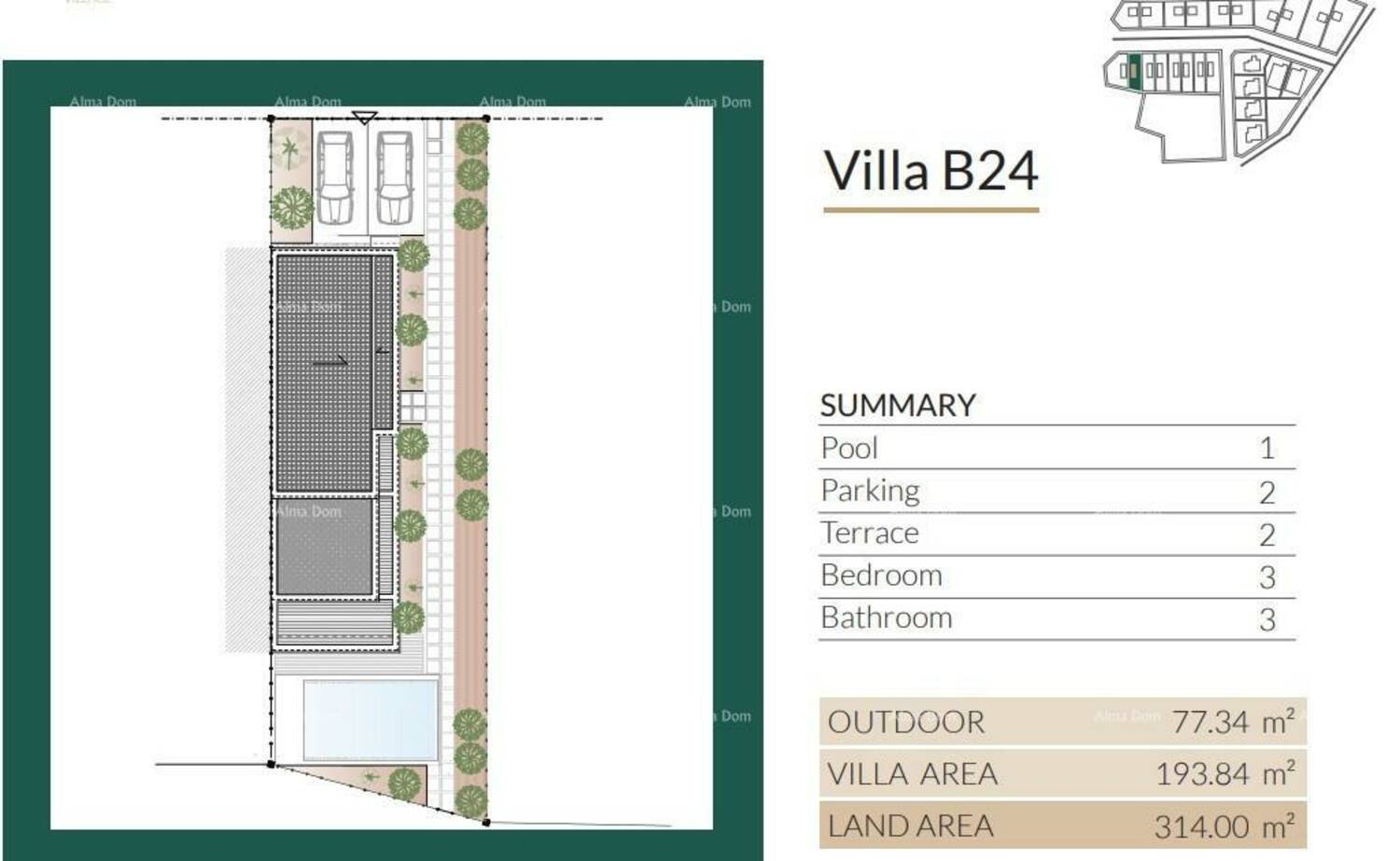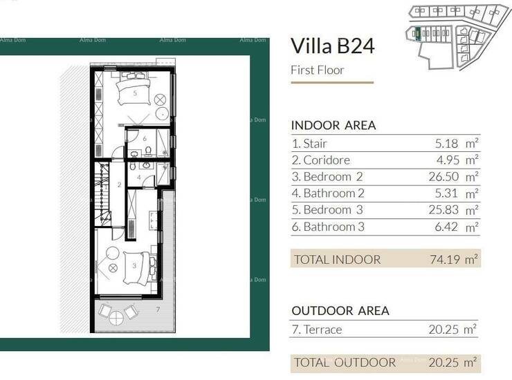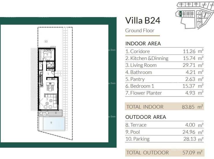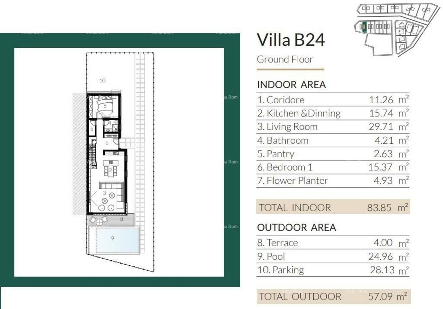 Villa B24, ukupne površine 211.95 m2 sastoji se od prizemlja i prvog kata. U prizemlju se nalazi hodnik, dnevni boravak, kuhinja sa blagovaonicom, kupatilo, spavaća soba, ostava i zeleni dio za cvijeće.