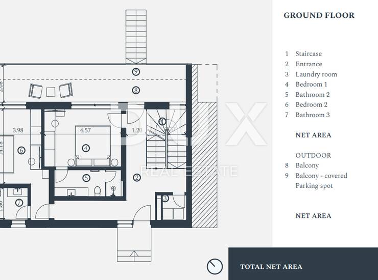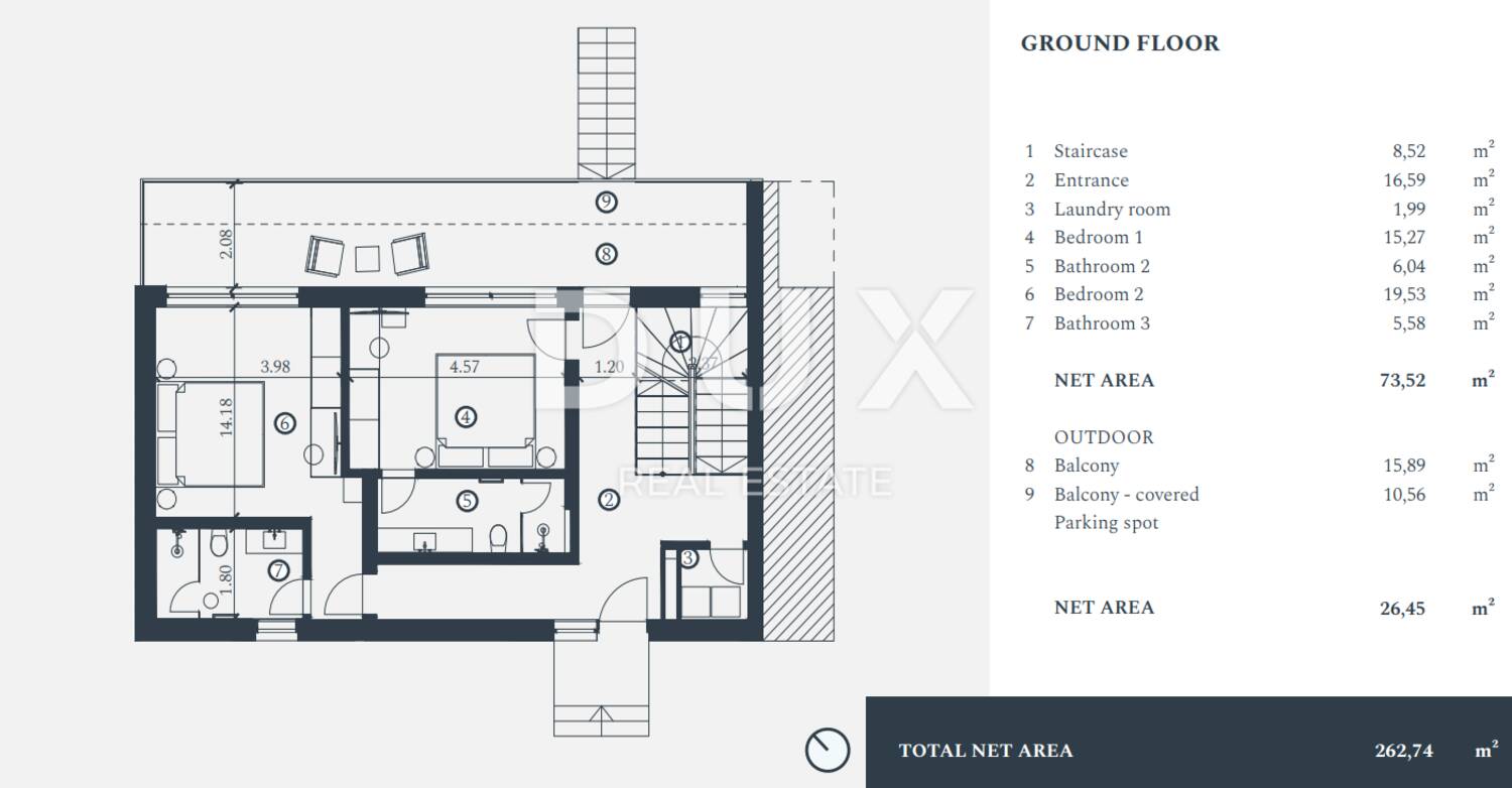 Sadrži dvije prostrane spavaće sobe, tri kupaonice te dodatni gostinjski WC.