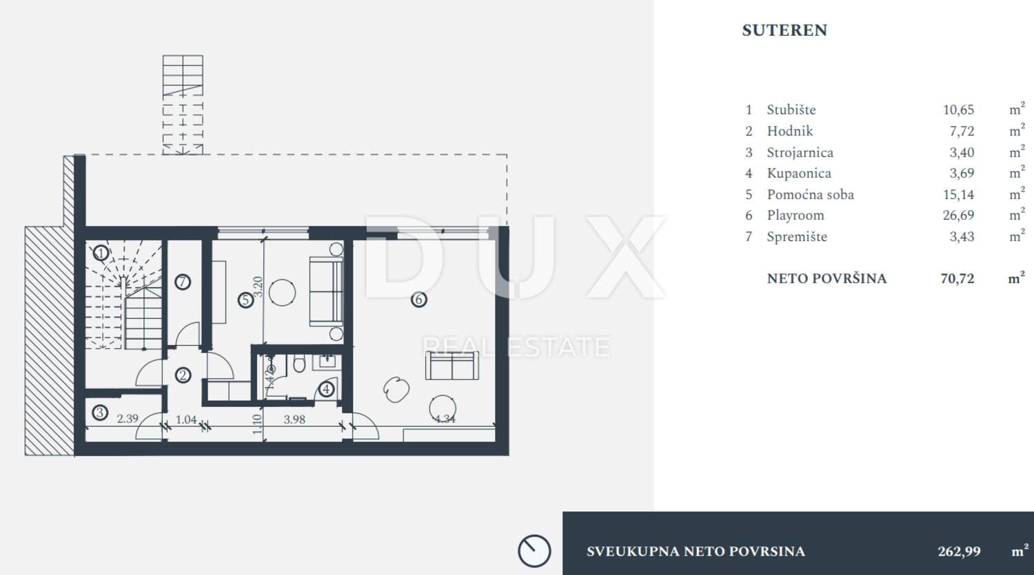 Nekretnina se prostire na tri etaže – suteren, prizemlje i prvi kat, a potpuno je opremljena i spremna za useljenje.