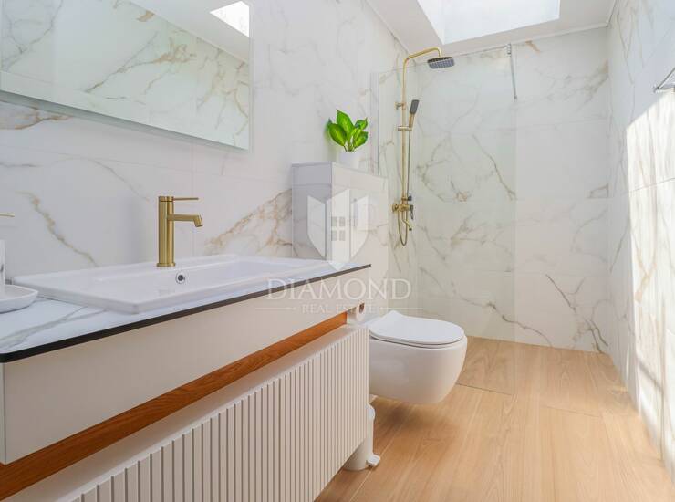 U prizemlju se nalazi prostrani dnevni boravak s blagovaonicom i kuhinjom otvorenog tipa, toalet za goste te praktično spremište. Iz dnevnog boravka izlazi se na lijepo uređenu okućnicu koja pruža dodatni prostor za uživanje na otvorenom. Na prvom katu smještene su dvije spavaće sobe, svaka sa svojom kupaonicom, dok se na drugom katu nalaze još dvije spavaće sobe i dvije kupaonice. Prilikom uređenja kuće posebna pažnja posvećena je detaljima, čime je postignut skladan spoj funkcionalnosti i estetike, uz dozu modernog šarma. U svim kupaonicama, kao i u dnevnom boravku i kuhinji, postavljeno je podno grijanje, dok su spavaće sobe opremljene klima uređajima koji osiguravaju ugodnu temperaturu tijekom cijele godine. Svaka prostorija ima svoj klima uređaj, čime je osigurano efikasno grijanje i hlađenje.