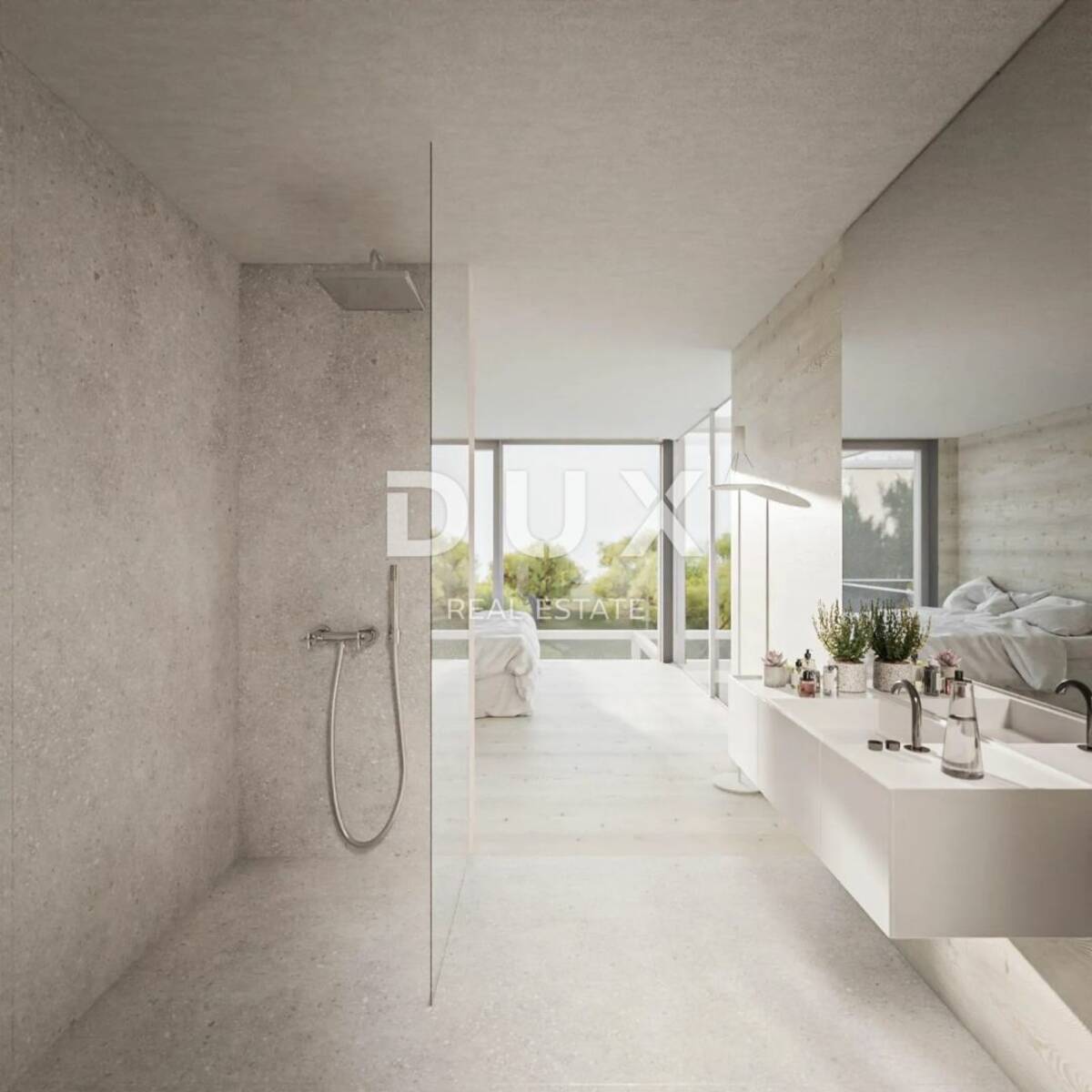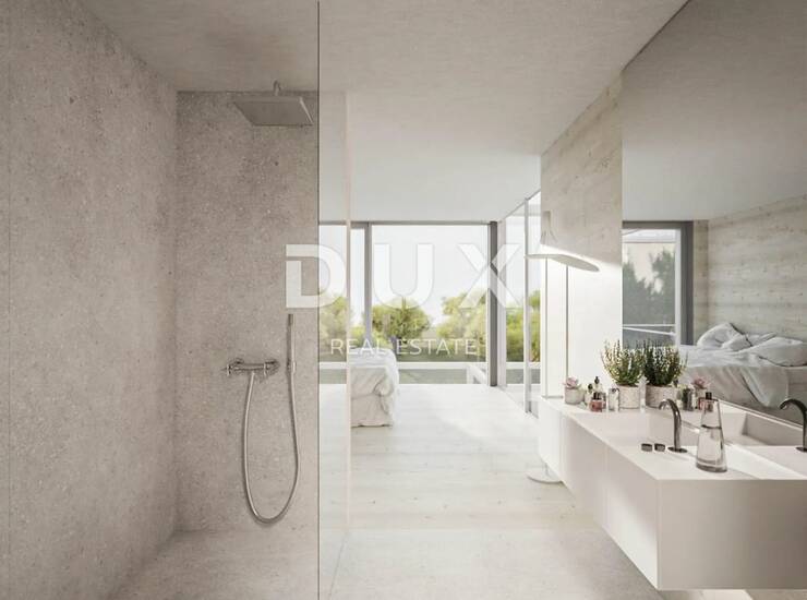 Prizemlje vile čini open-space dnevni boravak s velikim staklenim stijenama i izravnim izlazom na terasu, kuhinja povezana s blagovaonicom, garderoba i gostinjski toalet. Prostor je funkcionalno osmišljen, s odličnim prirodnim svjetlom i direktnom vezom s eksterijerom.