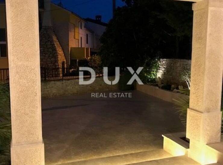 Dvorište kuće je obloženo kvalitetnim kamenom kanfanar I. klase, a ručno izrađeni stupovi dodaju jedinstvenu estetiku. Za udobnost i uživanje u prostoru, kuća je opremljena grijanjem na kamin, uz sustav cijevi koji omogućuje ravnomjerno raspodjeljivanje toplog zraka u svim prostorijama. Regulacija snage puhanja i prozračivanja je moguća putem daljinskog upravljača, pružajući potpunu kontrolu nad temperaturom u svakoj sobi.