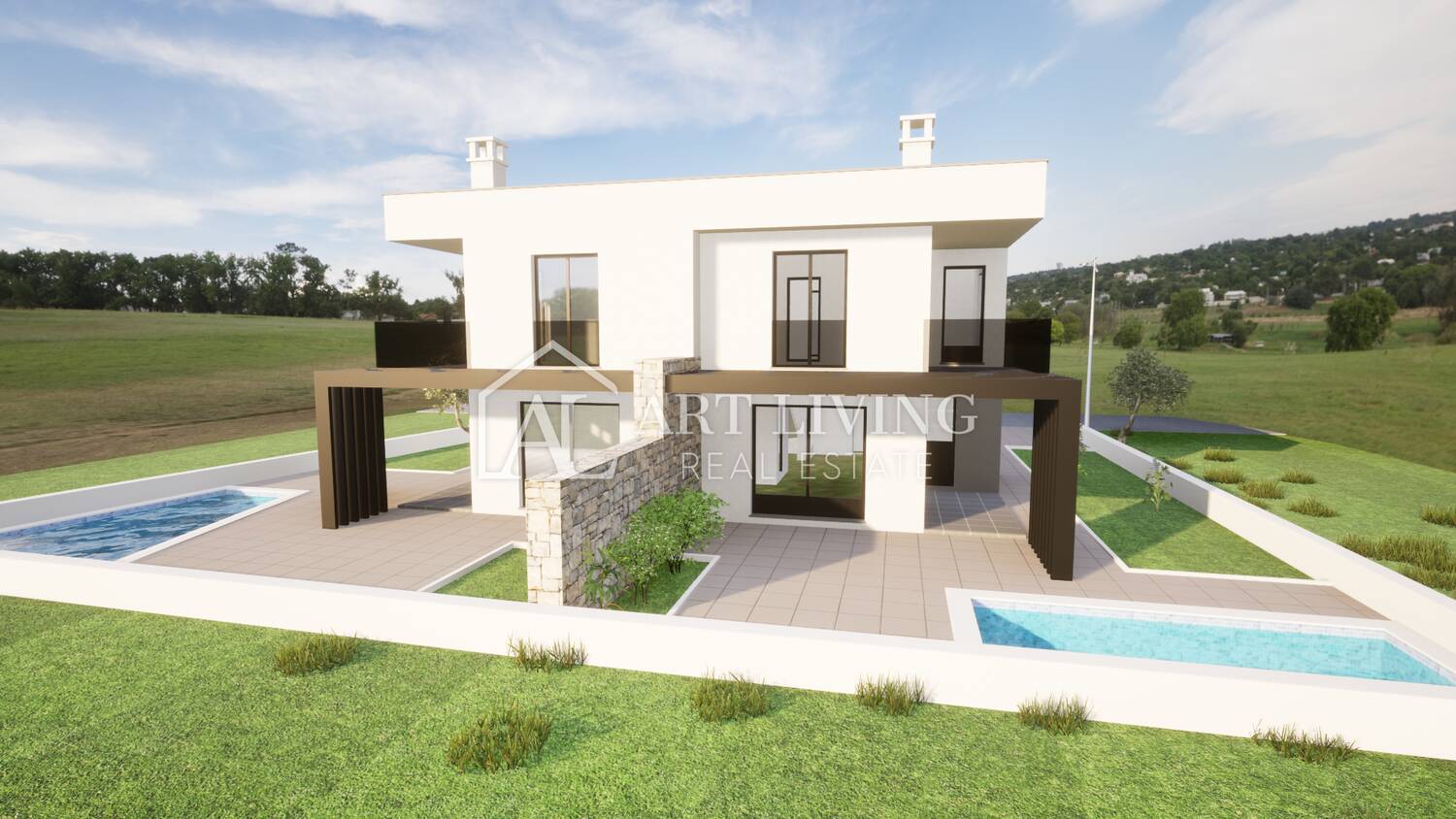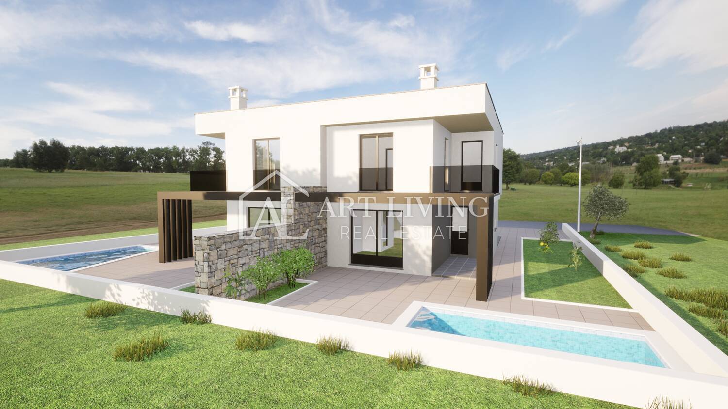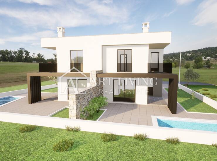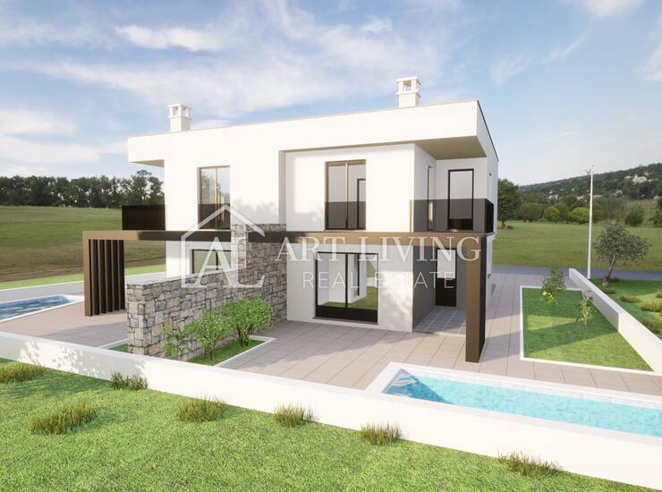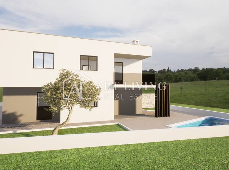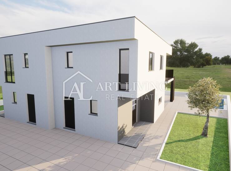 Prodaje se dvojna vila s bazenom u novogradnji moderne arhitekture, udaljena 3 500 m od centra grada Umaga i mora sa pogledom na okolicu i pejzaž.