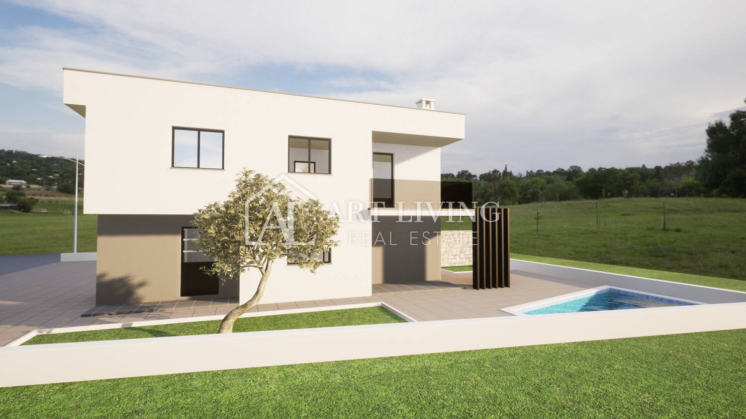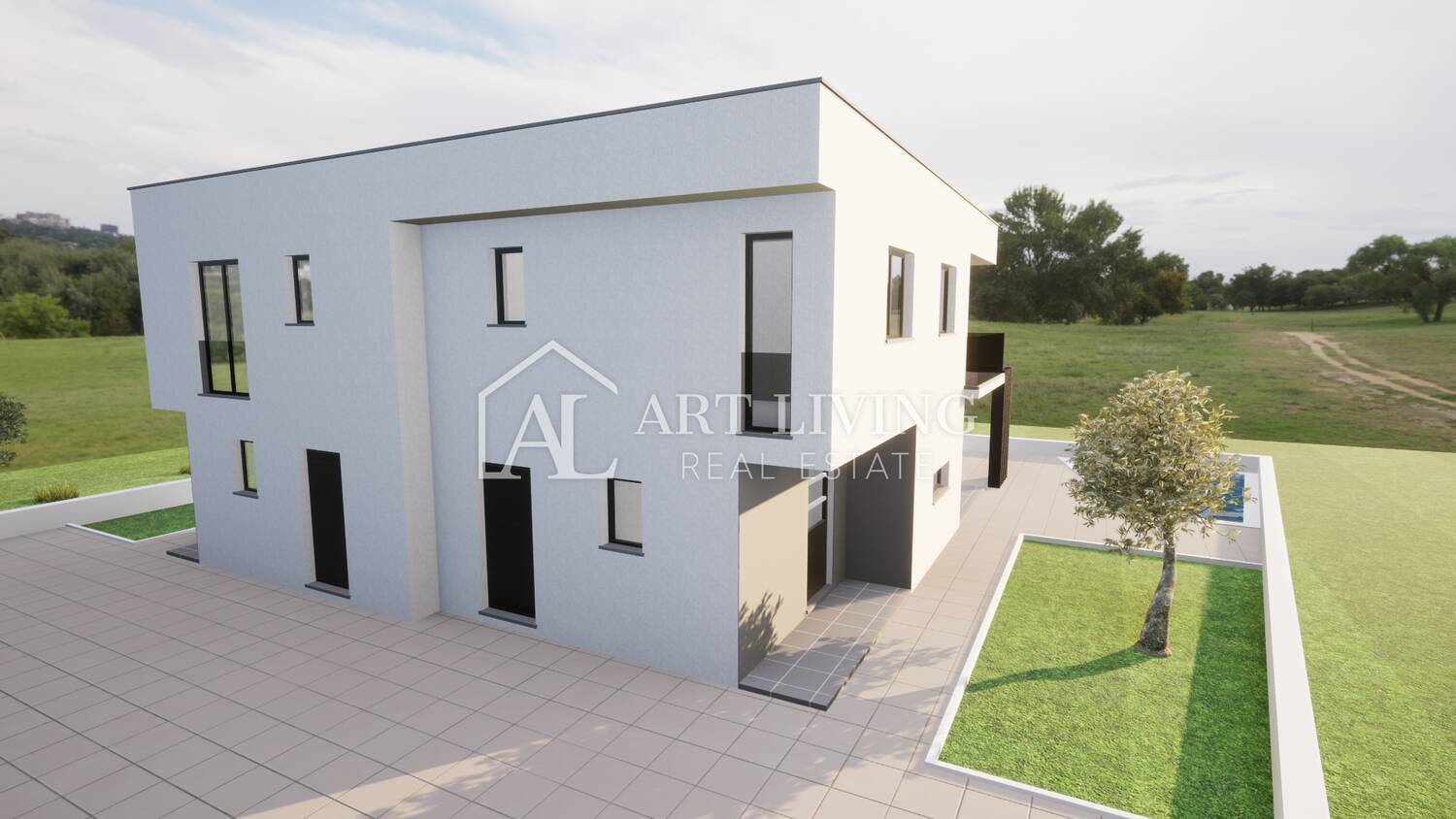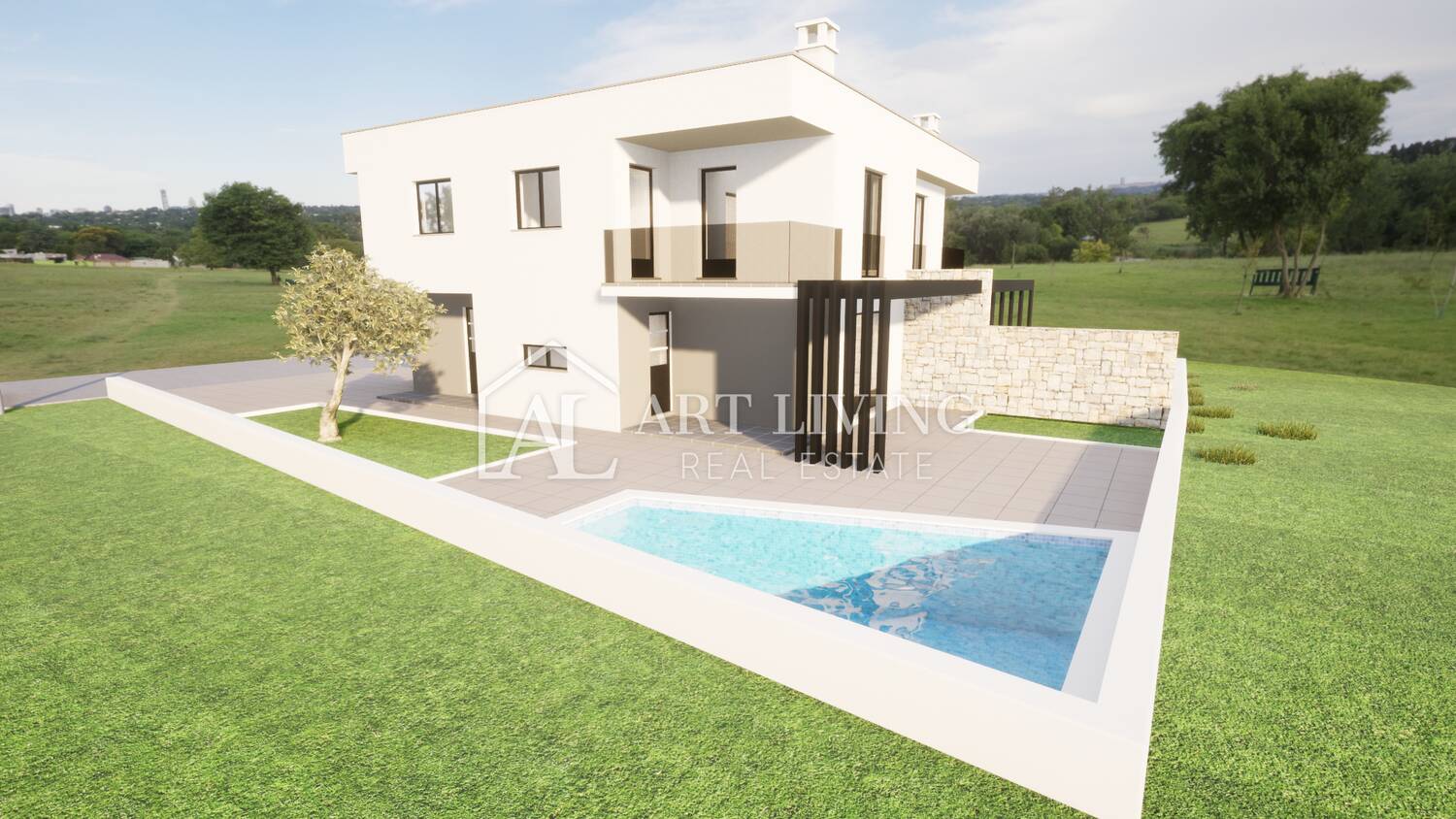 Prodaje se dvojna vila s bazenom u novogradnji moderne arhitekture, udaljena 3 500 m od centra grada Umaga i mora sa pogledom na okolicu i pejzaž.