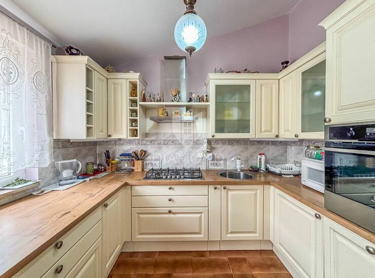 Kuća se sastoji od podruma i prizemlja. Prizemlje površine 116 m² čini glavni stambeni dio kuće, koji uključuje ulazni hodnik, kuhinju, dvije spavaće sobe, kupaonicu s podnim grijanjem, zaseban wc, prostrani dnevni boravak s blagovaonicom i izlazom na veliku sunčanu terasu od 37 m². Ispod terase se nalazi dodatni poslovni prostor, podrum veličine 22m2 . Zahvaljujući funkcionalnom rasporedu i prirodnom svjetlu, ovaj prostor se s lakoćom može prenamijeniti u simpatičnu garsonijeru ili koristiti kao izdvojeni stambeni prostor.