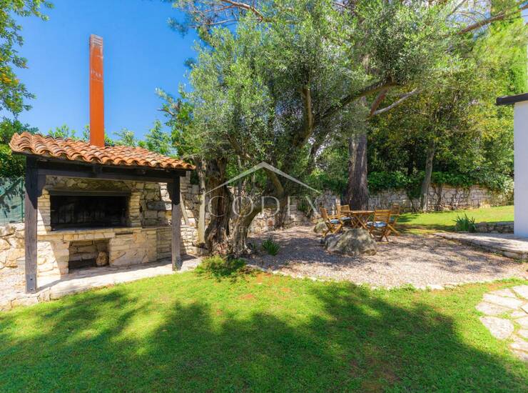 Uređeni vrt bogat autohtonim mediteranskim biljem. Bazen (25 m²) diskretno zaklonjen od pogleda. Prostrana terasa s roštiljem i vanjskim namještajem.