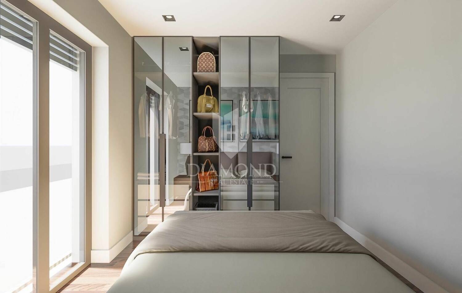 Stan se smjestio na 1. katu manje zgrade od svega 4 stana. Stan je ukupne površine 72m2 i sastoji se od 2 spavaće sobe, 2 kupaonice, kuhinje i dnevnog boravka iz kojeg se izlazi na terasu sa koje se prostire panoramski pogled na more. Stan ima podno grijanje i klima uređaje pomoću kojih je također moguće i grijanje i hlađenje. Stanu prpada spremište i jedno parkirno mjesto sa napajanjem za električno vozilo.