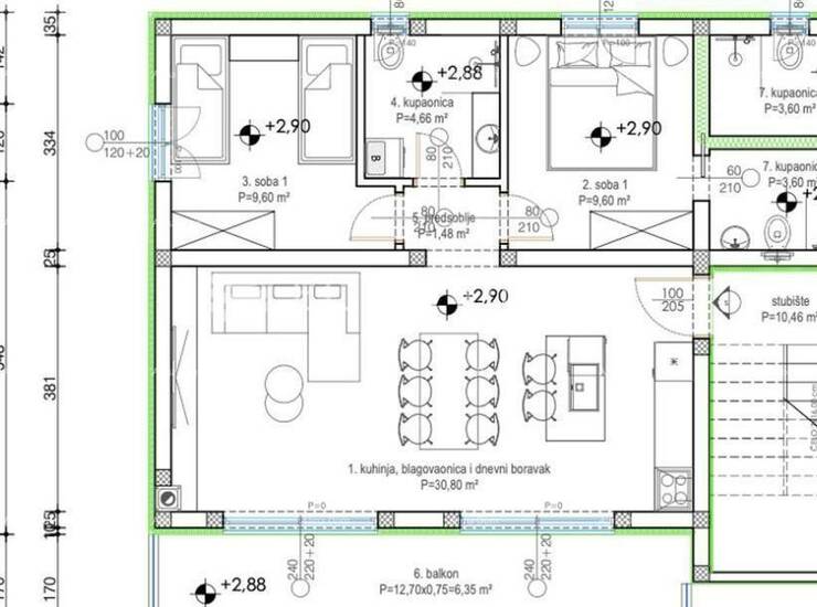 Stan se nalazi na 2. katu stambene zgrade i sastoji se od: ulaznog hodnika, open space kuhinje, blagovaone i dnevnog boravka s izlazom na natkriveni balkon, 2 spavaće sobe i 2 kupaonice