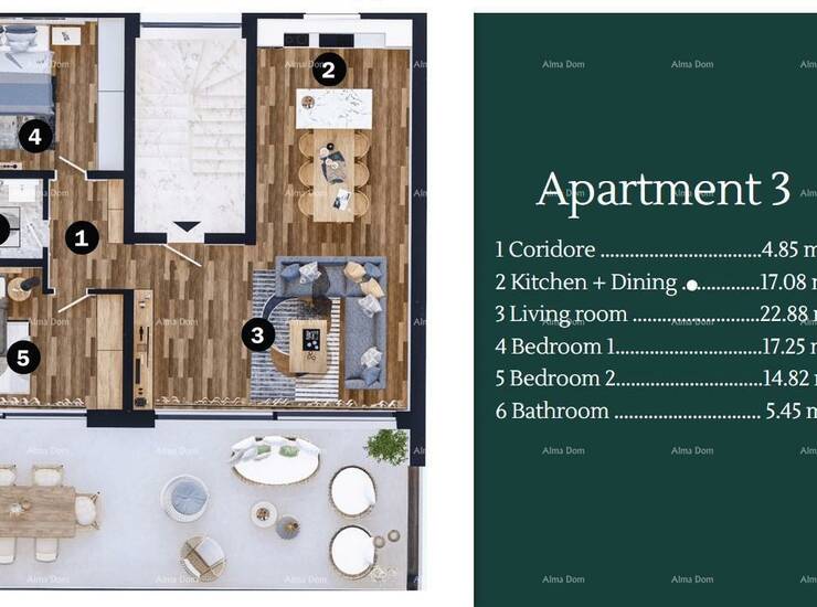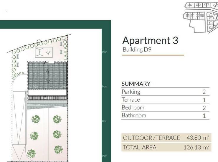 Apatman 3, ukupne površine 126.13 m2 (82.33m2 apartman+43.8 m2 terasa) nalazi se na 1.katu. Apartman se sastoji od hodnika, dnevnog boravka, kuhinje sa blagovaonicom, 2. spavaće sobe, kupatila, i terase.