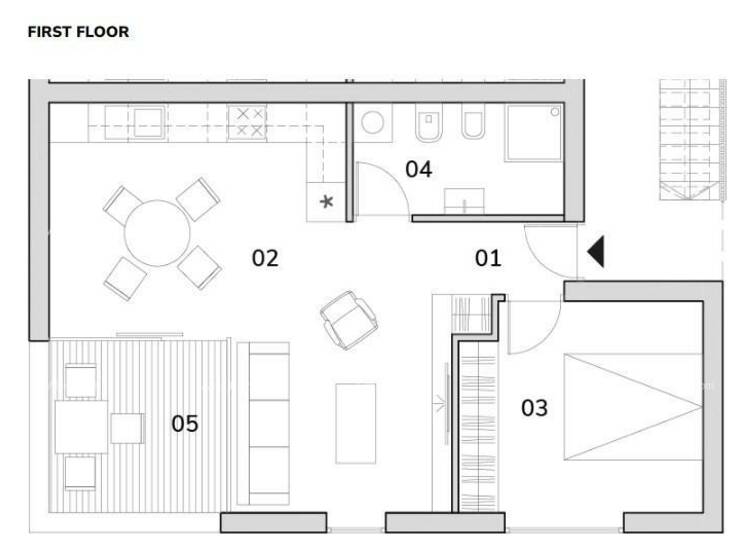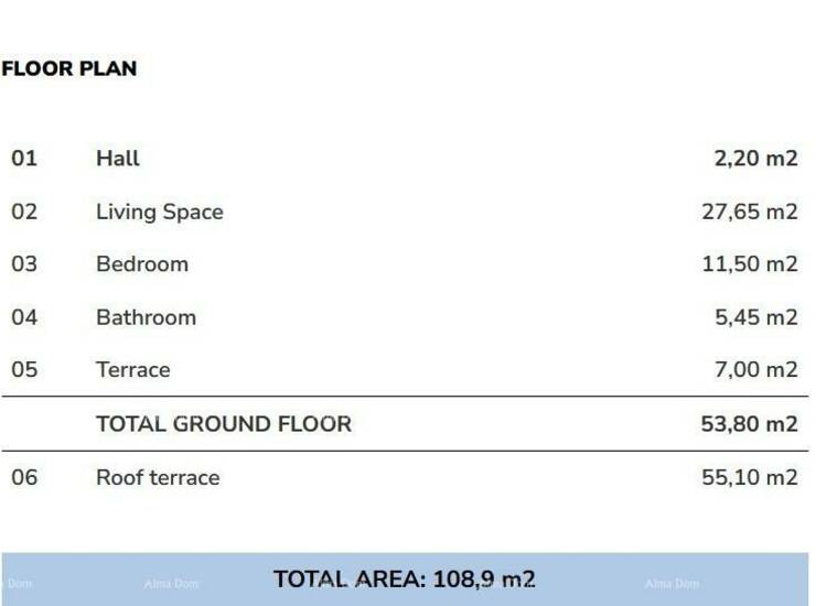 Stan se sastoji od hodnika, spavaće sobe, kupaone, prostranog dnevnog boravka sa kuhinjom i blagvaonom, terase i velike krovne terase od 55.10 m2.