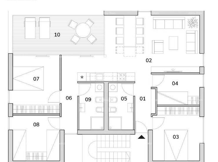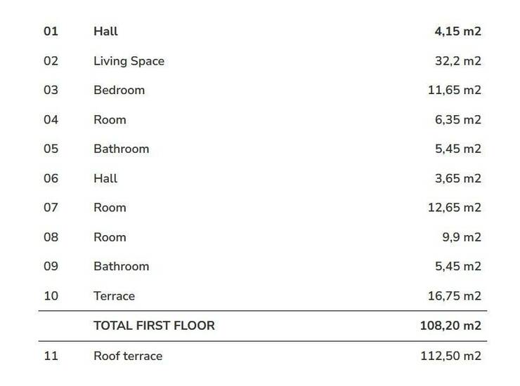 Stan se sastoji od hodnika, 4 spavaće sobe, 2 kupaone, prostranog dnevnog boravka sa kuhinjom i blagvaonom, terase i velike krovne terase od 112.5 m2.