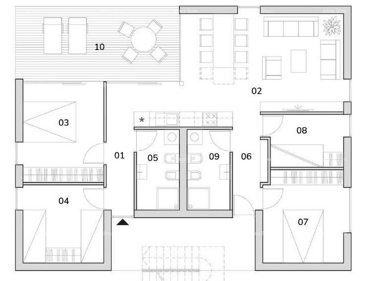 Stan se sastoji od hodnika, 4 spavaće sobe, 2 kupaone, prostranog dnevnog boravka sa kuhinjom i blagvaonom, velike terase i vrta od 274.80 m2.