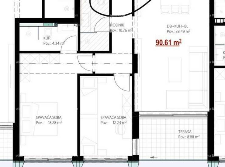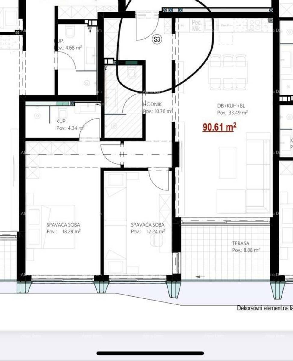 Stan S3, površine 90.61 m2, nalazi se na 1. katu i sastoji se od hodnika, dvije spavaće sobe 2 kupatila, dnevnog boravka sa kuhinjom, blagavaonom i terasom.