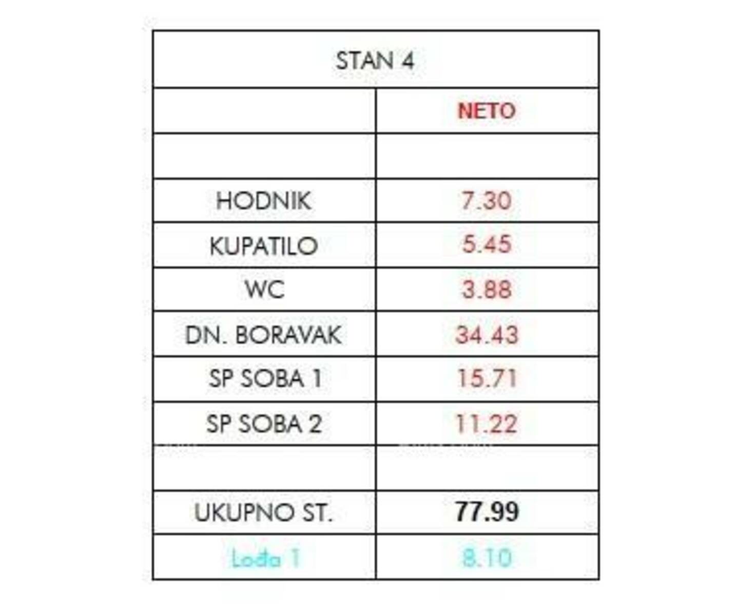 Stan 4, površina 84,06 m2 nalazi se na 1. katu zgrade i sastoji se od hodnika, kuhinje i dnevnog boravka, 2 spavaće sobe, WC i kupaonice. Stan ima lođu 8,1 m2.