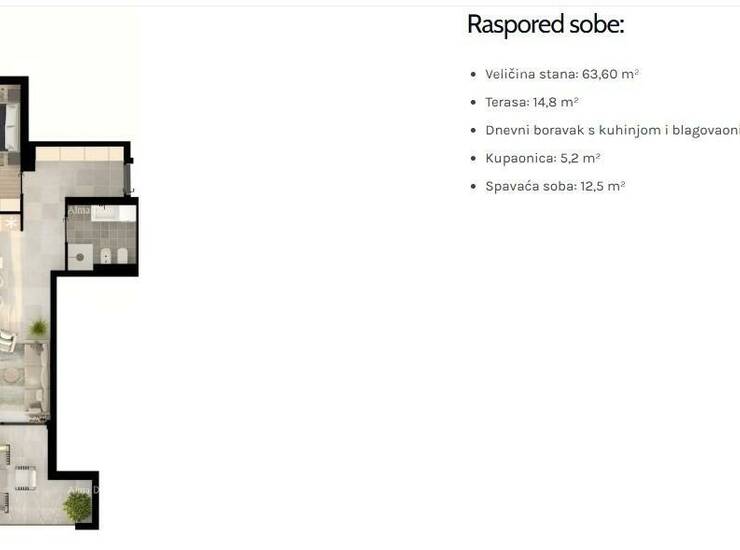Stan S77, ukupne površine 63,60 m², nalazi se na 1.katu zgrade i sastoji se od: