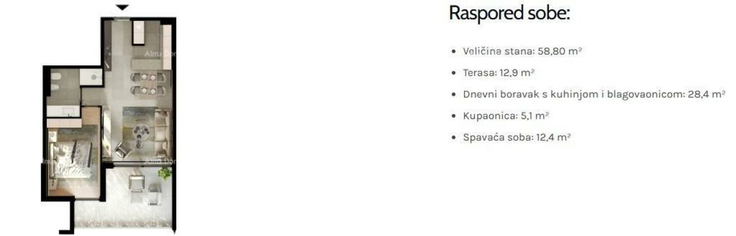 Stan S7, ukupne površine 58,80 m², nalazi se na 1.katu zgrade i sastoji se od: