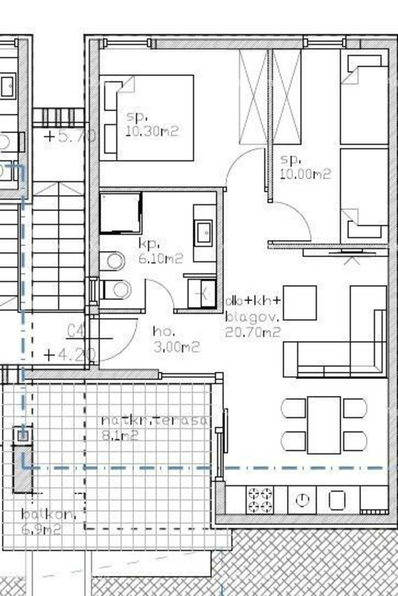 U bloku C nalazi se stan površine 55.88 m2, koji se nalazi na 2.katu bloka. Stan se sastoji od ulaznog hodnika, kuhinje, dnevnog boravka i blagovaonice s izlazom na terasu, dvije spavaće sobe i kupaonice.